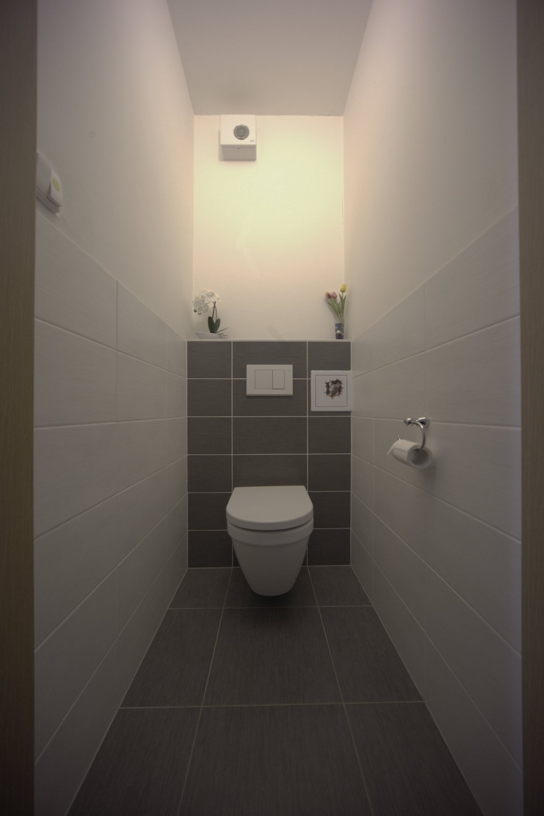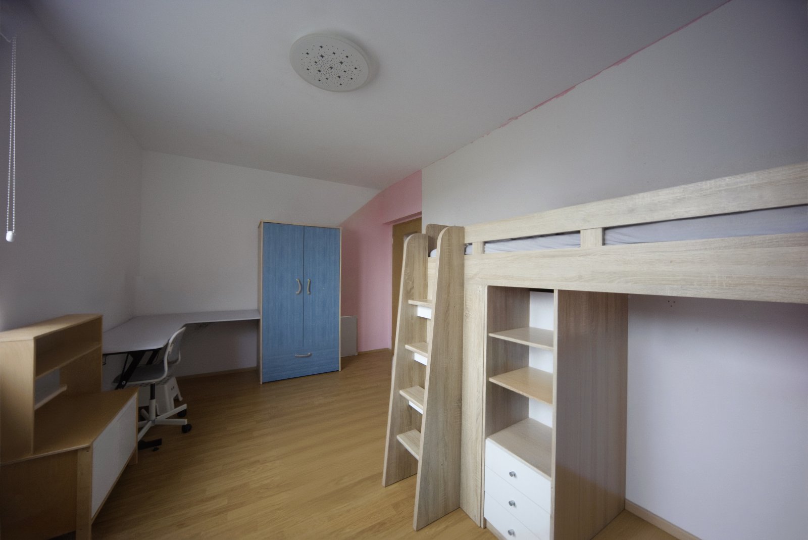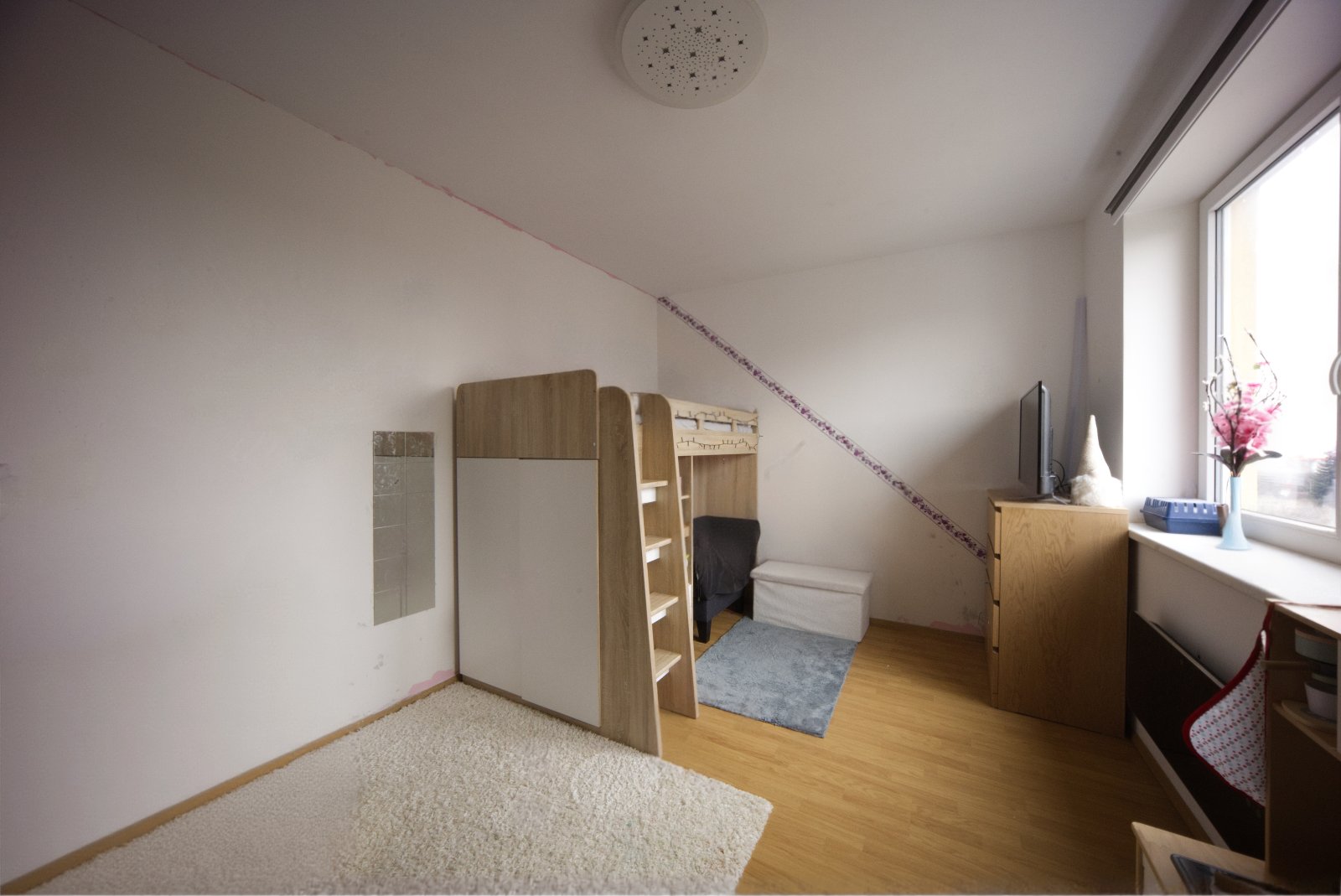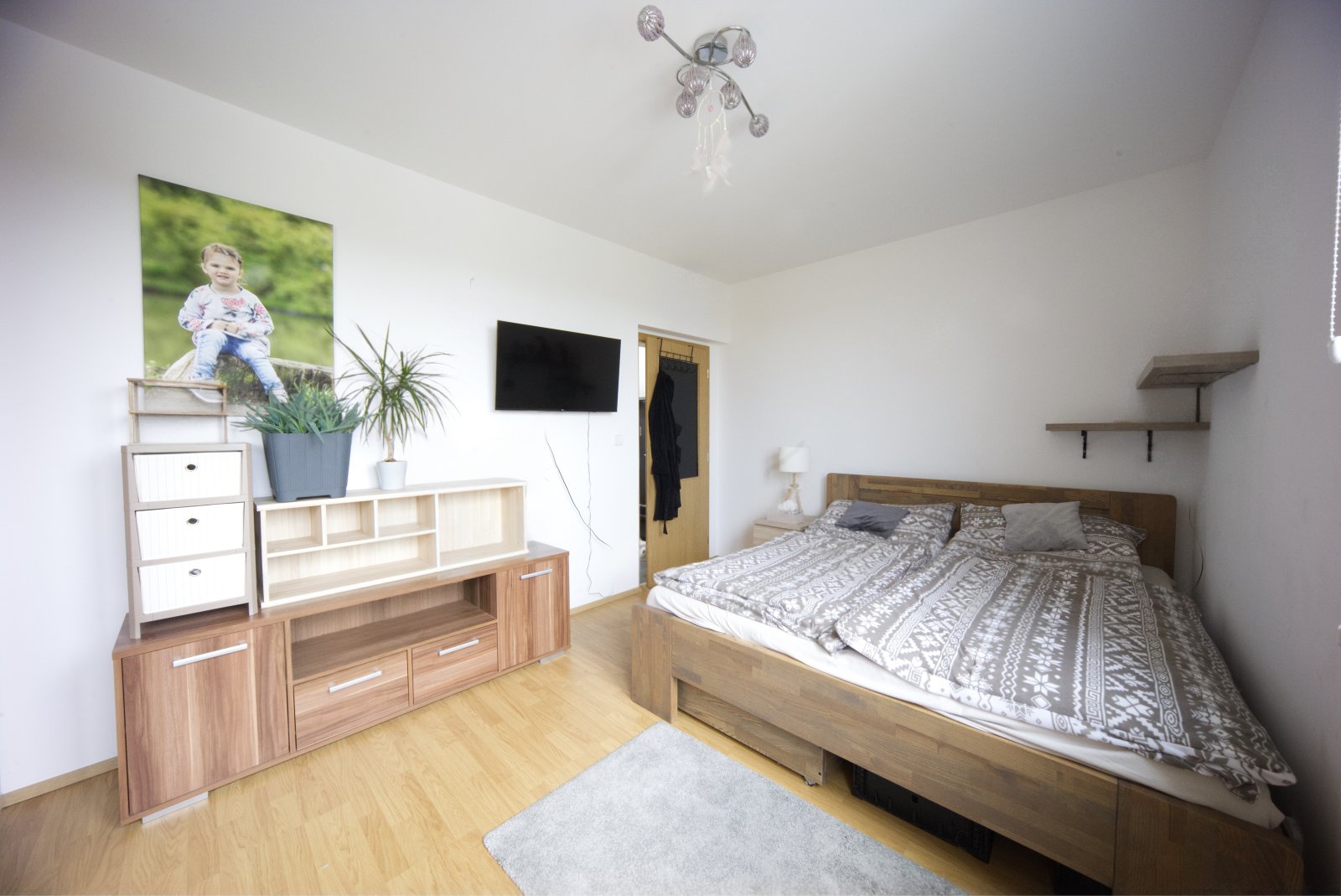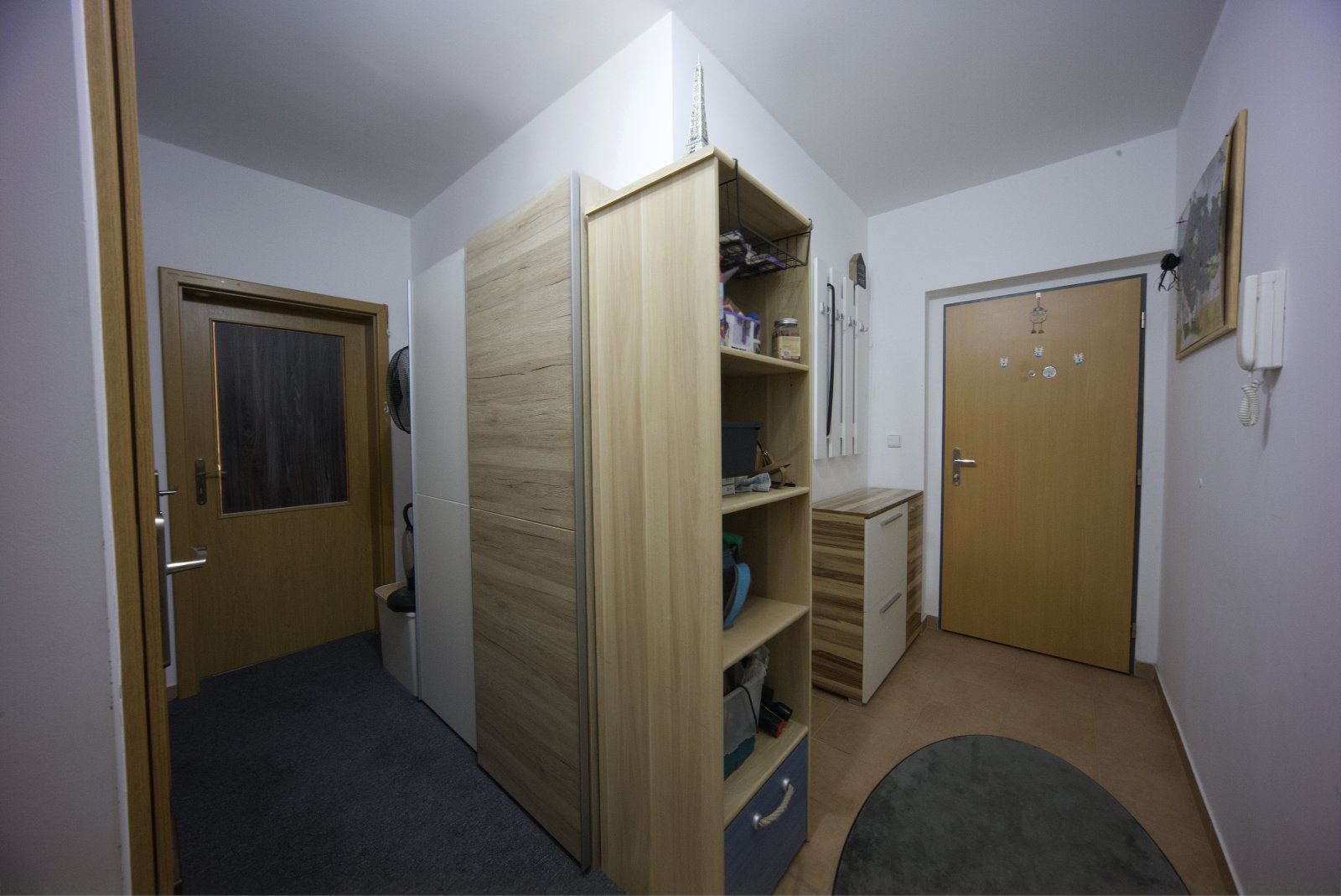 skříně, komora. Na podlaze plovoucí lamino a dlažba.