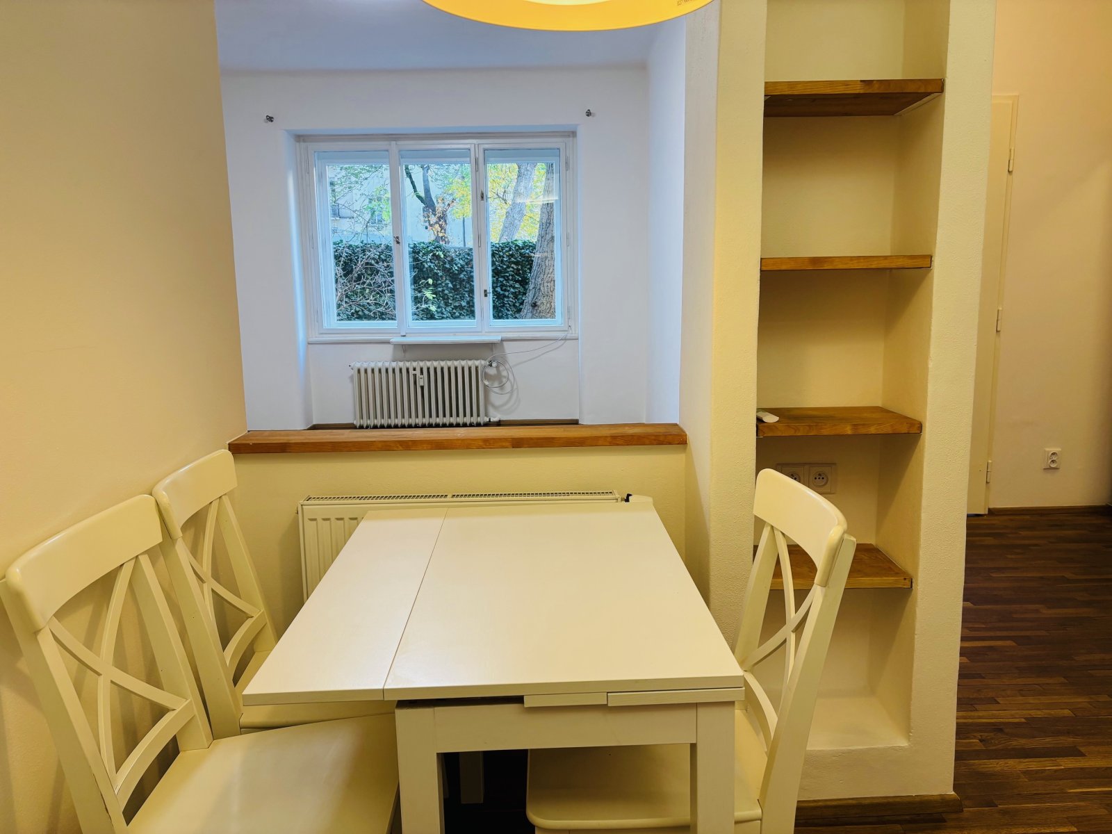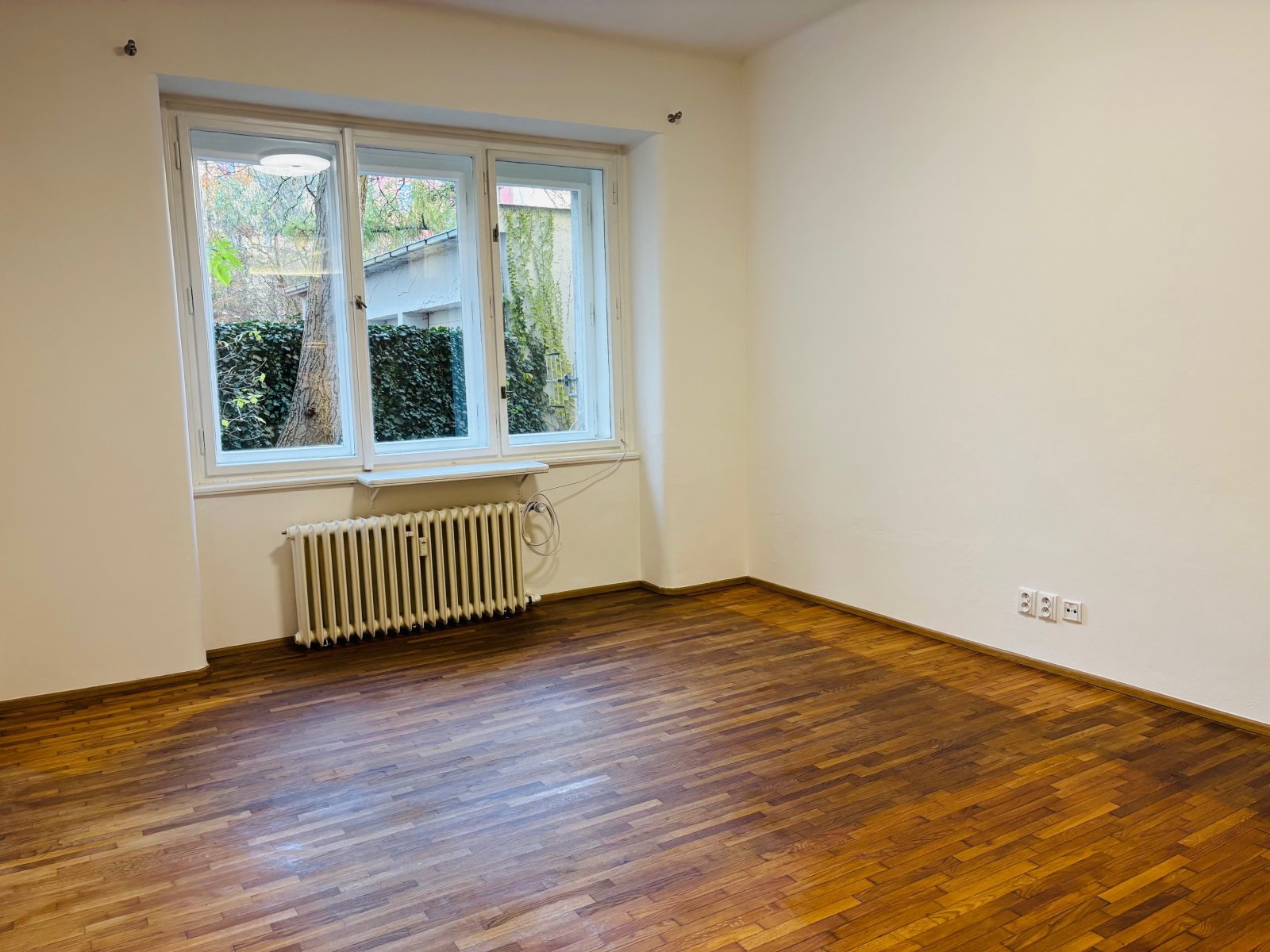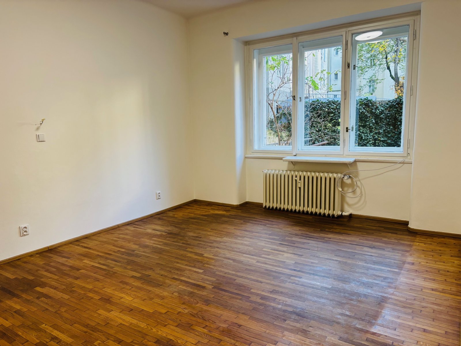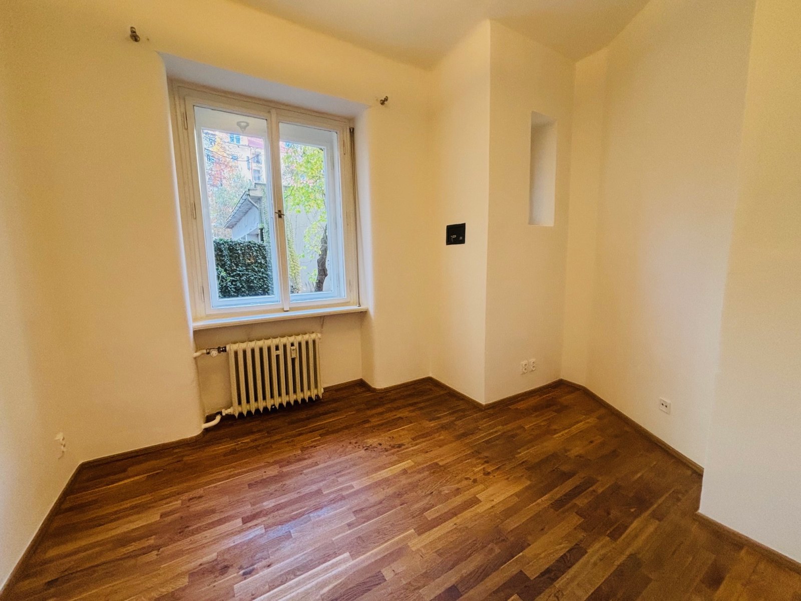 Na podlaze dřevěné parkety a dlažba. Výhled z bytu je do klidného