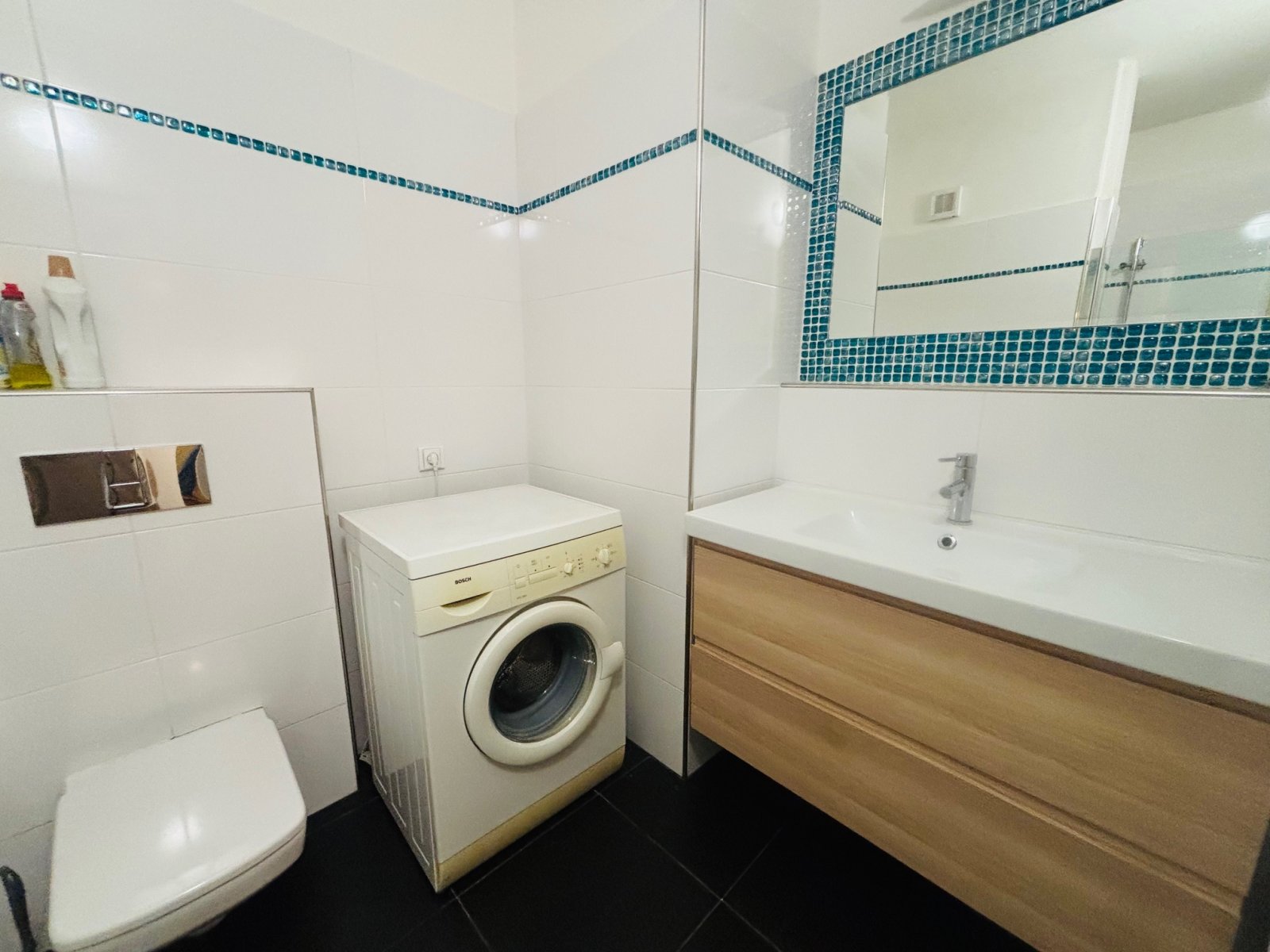 kout, zrcadlo, koupelnová skříňka, pračka a WC. V předsíni je šatní