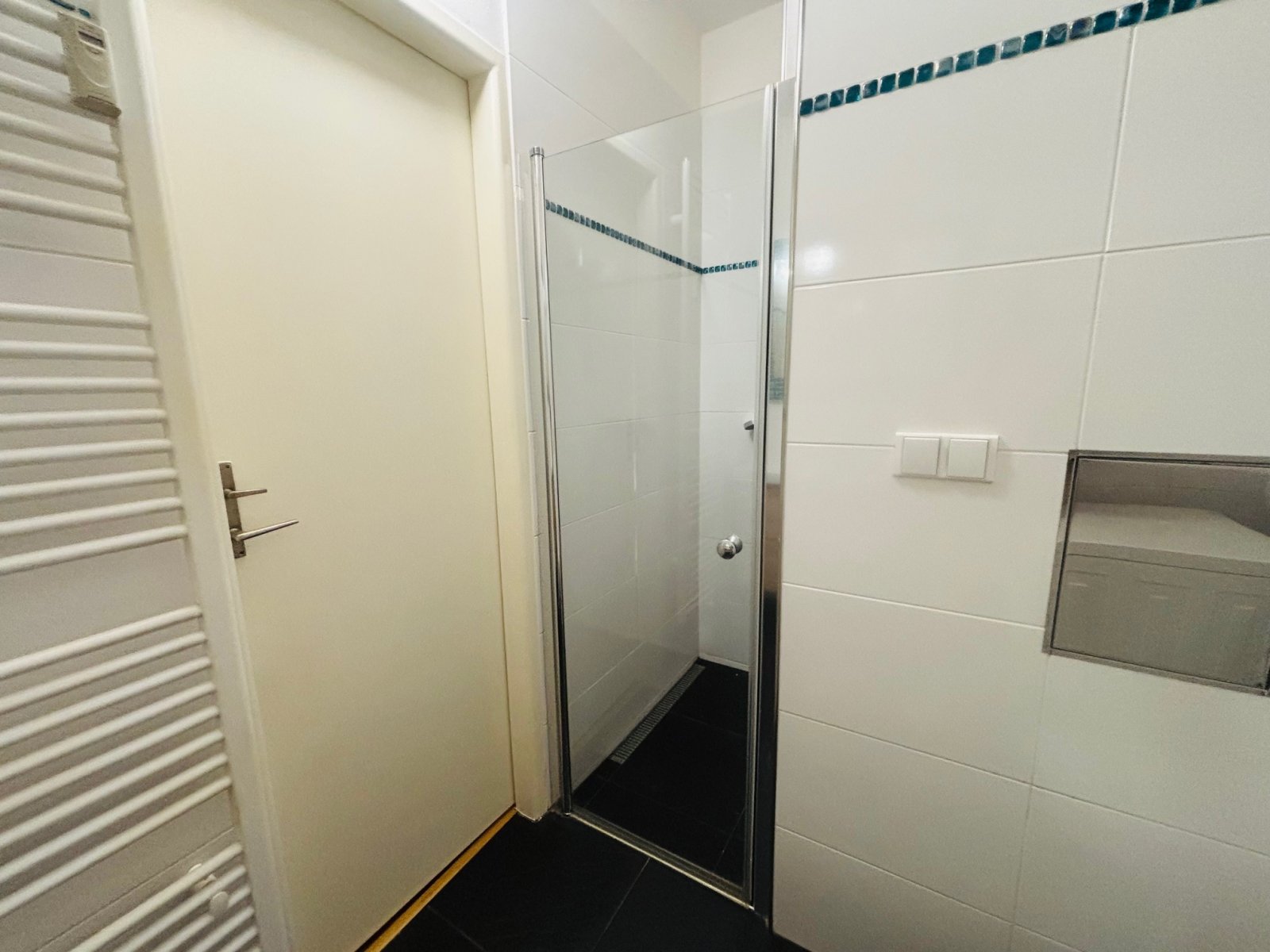 malá lednice s mrazákem), jídelní stůl se židlemi. V koupelně sprchový