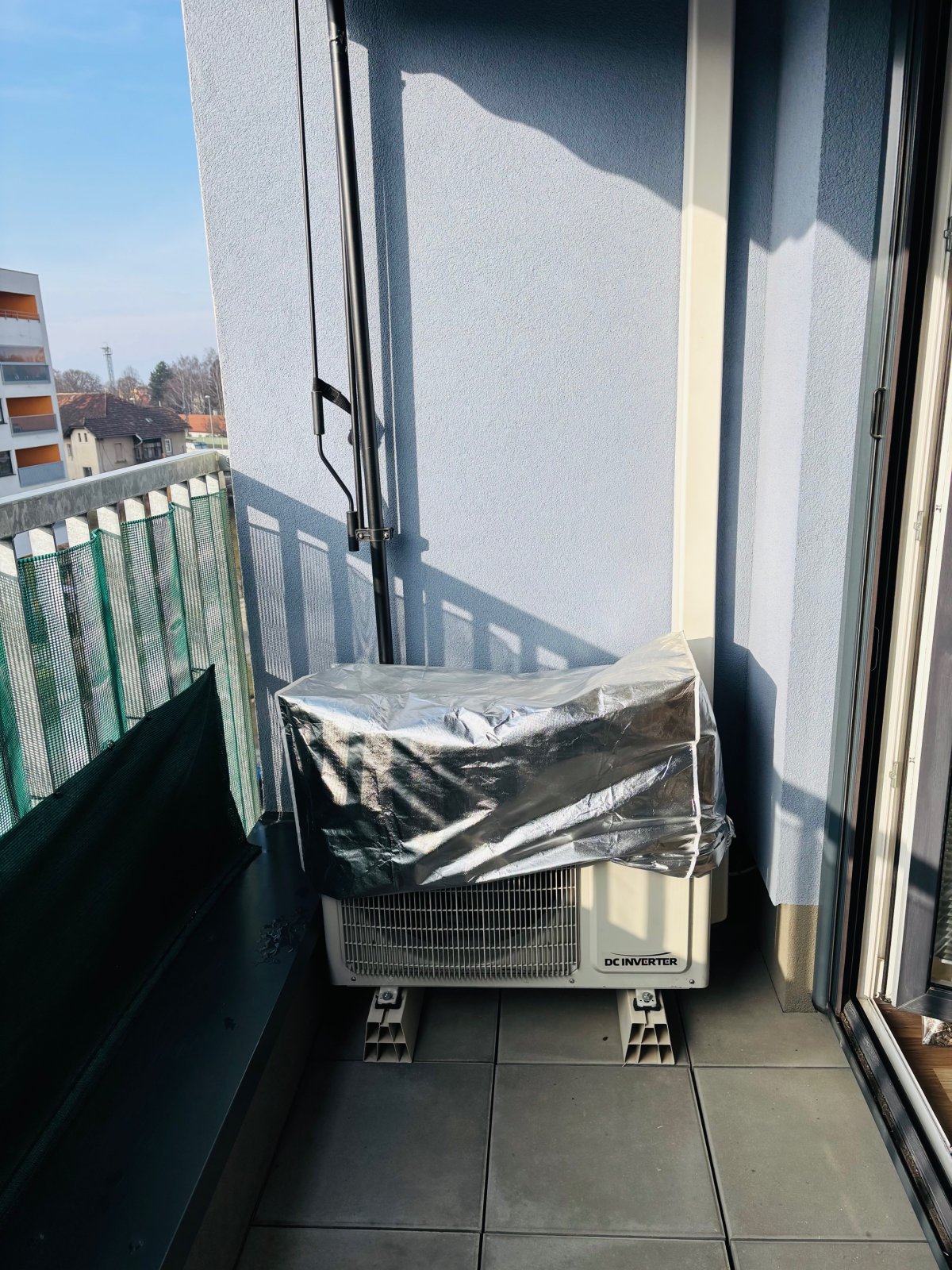 komora s pračkou a policemi. V celém bytě je klimatizace, sítě proti